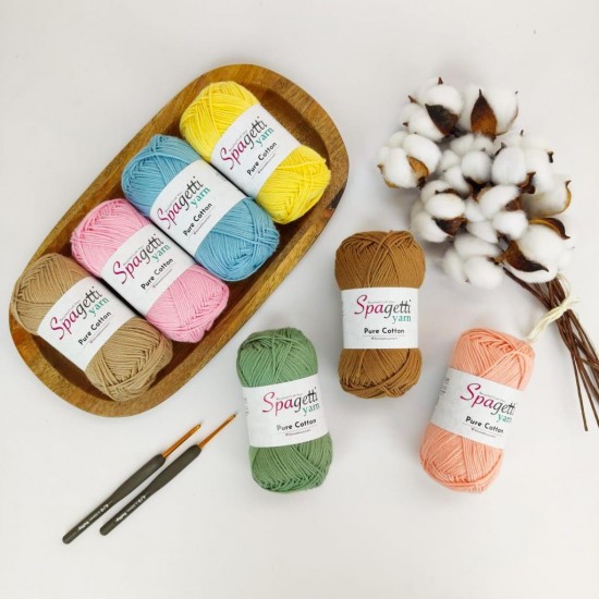 Spagetti Yarn Pure Cotton el örgü ipliği üstün kaliteli %100 pamuktan üretilmiştir. Hem şiş hem de tığ işi için kullanıma uygundur. Bu hafif iplik, yazlık giysiler, bebek ürünleri, punch projeleri, ev aksesuarları ve özellikle amigurumi projeleri için mükemmeldir.